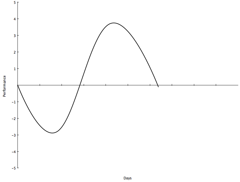 Basically, whenever you do a hard workout, there’s an immediate hit on performance. Over the next few day, as your body recovers, you come back to baseline and then show an improvement. The trick to all of this is that you want your next stimulus to be after you have at least reached your performance baseline or are on the positive side of the curve. If you do this, then the curves build on each other and you have a nice net positive improvement in performance.