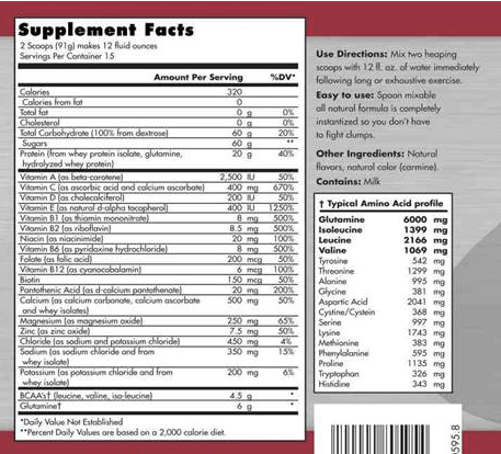 My trick came to me one day and I was feeling guilty about gulping down a serving of Ultragen after a hard workout. Looking on the back of the bottle, I read through the list of ingredients. While all the ingredients in Ultragen work synergistically, the two main ingredients are whey protein isolate and glucose— both of which are relatively inexpensive. These two ingredients also make a lot of sense to put into a recovery drink. Glucose (which has a glycemic index of a perfect 100) floods into the blood system almost immediately. This is THE most important ingredient because muscle cells soak up glucose much more readily in the first 20 minutes after exercise— so the faster you can get that glucose into the bloodstream, the better. Any other types of sugar (sucrose, fructose, etc) or longer sugar chains (e.g. maltodextrin) need to be broken down or converted into glucose molecules before they can be used by your body. Whey protein isolate also makes sense because it is the most “broken down” of all the variations on whey protein (e.g. whey protein, whey protein concentrate, and whey protein isolate). This means that the protein chains are the shortest and it is the easiest for the body to break down into individual amino acids. Using purified amino acids might be even faster, but that would likely be prohibitively expensive and yield a product that tastes awful.