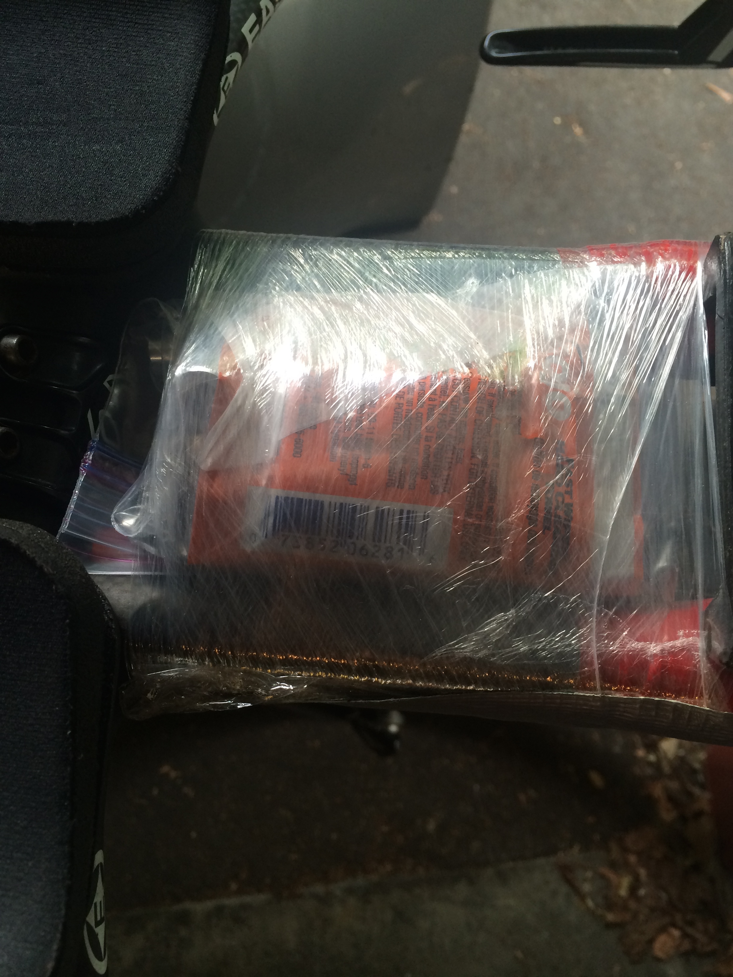 You know that flat kit you have on your bike? As nice as it is for training, it’s not the coolest thing to have on your bike on race day. It’s also not particularly aerodynamic. Instead, just place the contents between your aerobars and wrap it up with some shrink wrap. At least for this trick I’ve got some photos of the end product.