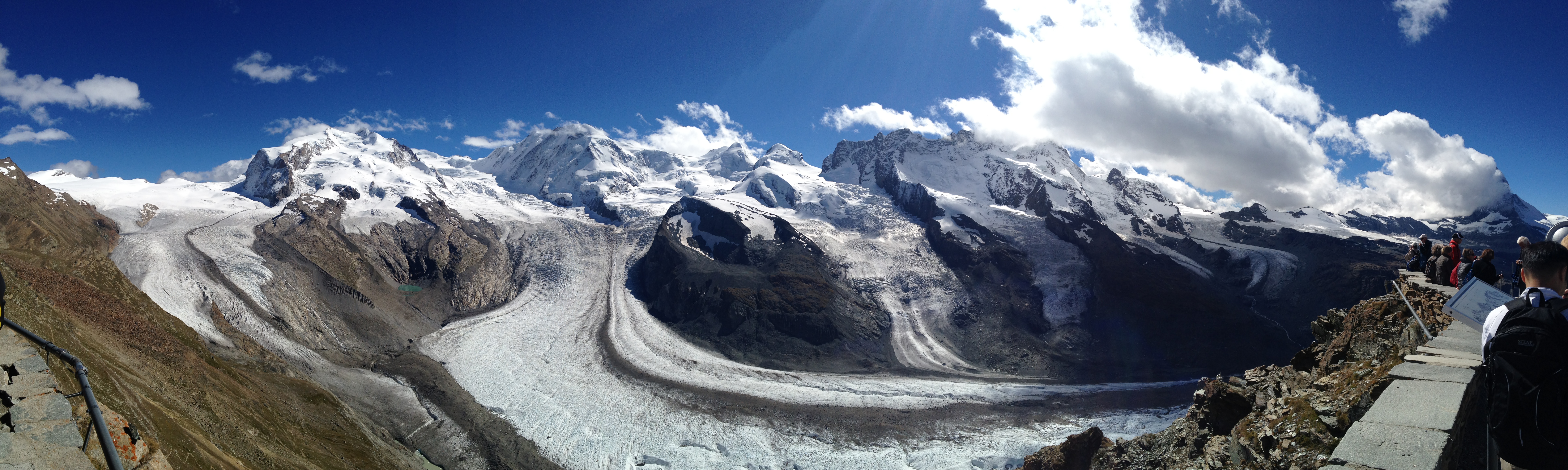 I had trained all year for the rigors of the race. For those in the Seattle area, this included brick repeats that included a six-mile run up Montreaux in Issaquah, two bike loops (60 miles total) that included Zoo Hill on each loop, and a closing 6-mile run that ran up Montreaux again. For those of you not familiar with these hills, let’s just say they’re “challenging” with good long stretches at 15+%. I went to Switzerland for the race. Then, I took a run around the opening 10K course at a stupidly easy pace (barely more than a walk). The course was pretty badly marked so I had to guess about where to go next. I came to an open park, looked to my left for the next turn, and BAM! My right calf had gone from “fine” to “not fine” in the space of two strides. I had to limp all the way back to the hotel. I called my PT back in Seattle and discussed my symptoms. I had a grade 2 calf strain and, unless some miracle could save me, my race was done– three days before it even started. I kicked myself for not having my Compex EMS and there was no way I would be able to get one in time (even though they’re made in Switzerland). So for the next three days (including race day), I studiously avoided anything to do with the race and became a tourist. I was super-disappointed but I have to say Switzerland is a great place to be disappointed. The trains run everywhere and I got to see some amazing sites I would have never seen had I done the race. Not exactly the end of the world. Here’s a panoramic shot that I took on race day from Gornergrat with the Matterhorn on the right side playing peekaboo with a cloud. Nevertheless, my hopes and dreams for a year were smashed. So, yeah, calf strains can be catastrophic.