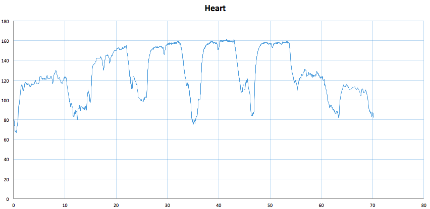 Here is the same workout, now showing my heart rate. Yes, you can see where my heart rate went down between each interval. And yes, you can even see where I chased the kid’s soccer ball. But this data isn’t anything that I could have used during my workout. My heart rate before my fourth interval was very close to my heart rate before my third interval– and both were far lower than my heart rate before my second interval when I started running much faster.