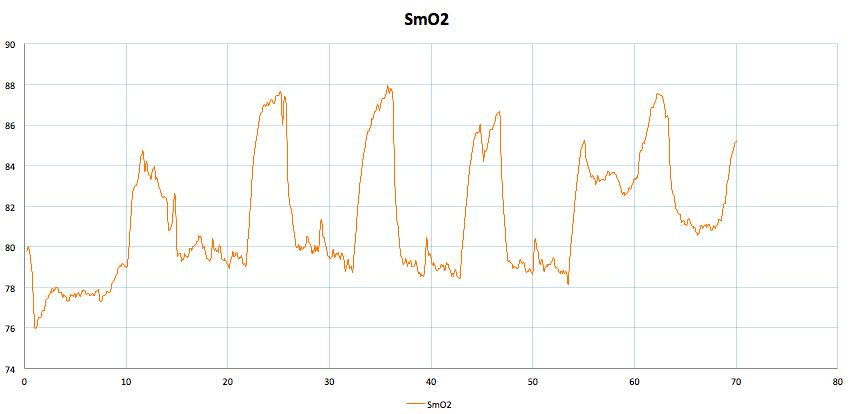 In the case of my workout, my SmO2 values were only going up– not down– during my recoveries. This is because I was giving my body a pretty long recovery between each effort– four full minutes. This is because these intervals were supposed to run nearly all-out. Because of the long recovery between each interval, I would not want to see an SmO2 drop of more than a point– preferably less than half a point.