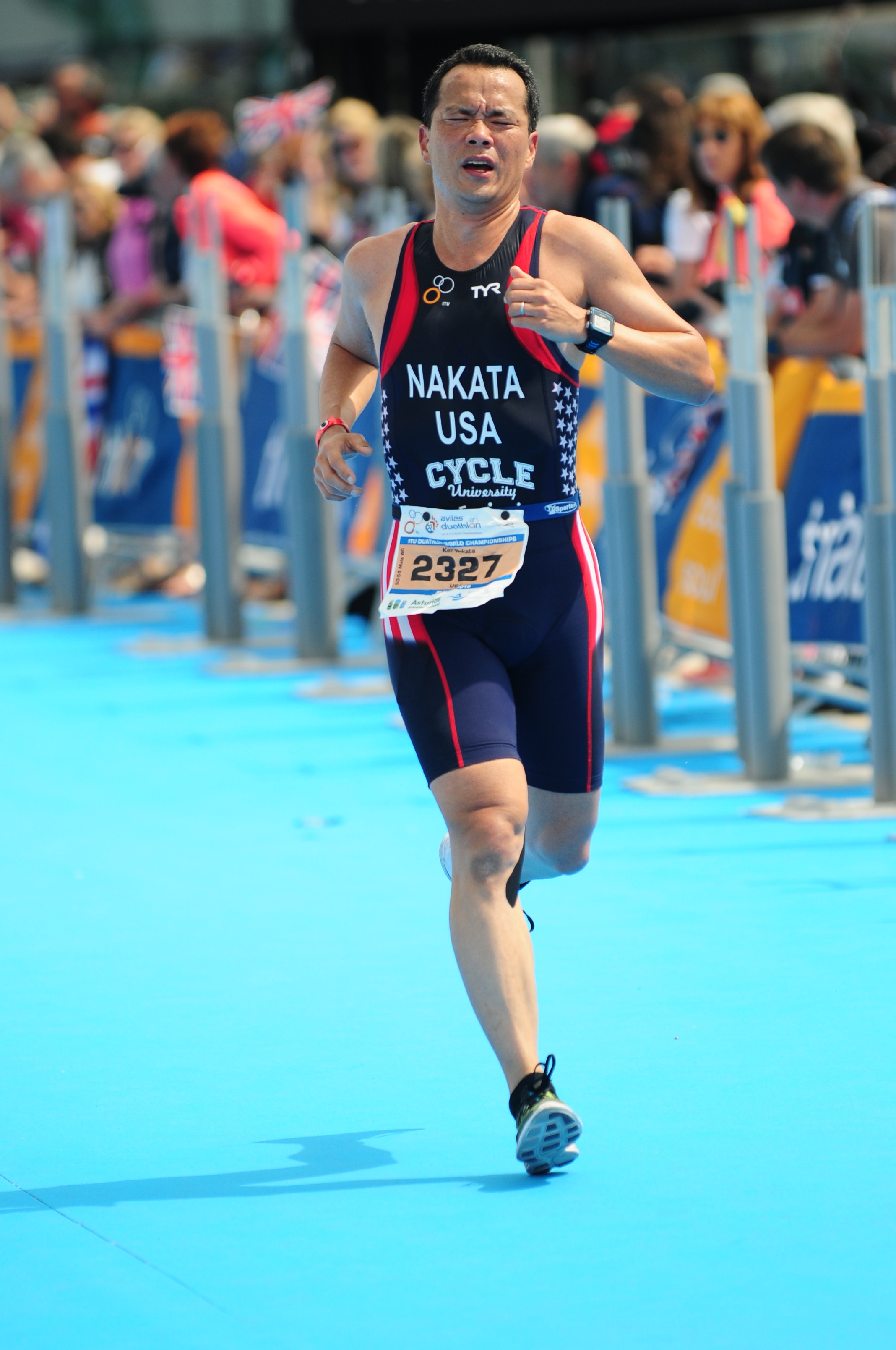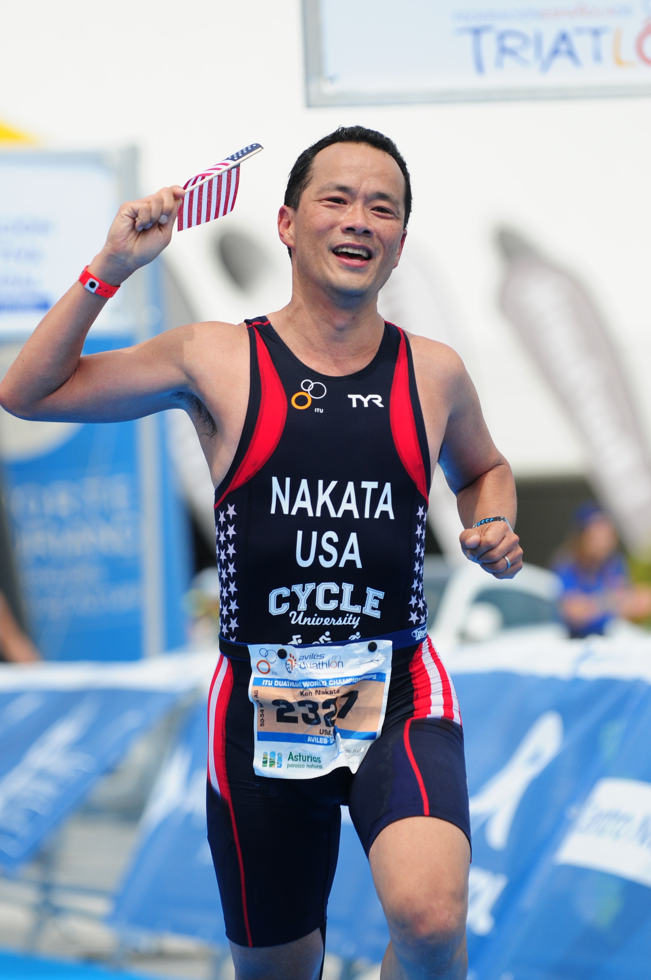 Finishing runAt the team briefing, Tim reminded us that there are countless Americans who would give almost anything to wear the Stars and Stripes in a World Championship.  The moment Tim handed me the flag, doubt and uncertainty just lifted.  It was as if the short distance from there to the finish line was the only thing in the world that mattered.  I was now running with great form and, despite being down on myself all day, I was now elated and couldn’t stop smiling.  Yeah, this was my lousiest performance at Worlds.  Sure, I could have done a million things better to prepare for this race.  None of that mattered now.  I had run the gauntlet through my deepest doubts and now was wearing the Stars and Stripes at the finish line of a World Championships!  How cool is that?