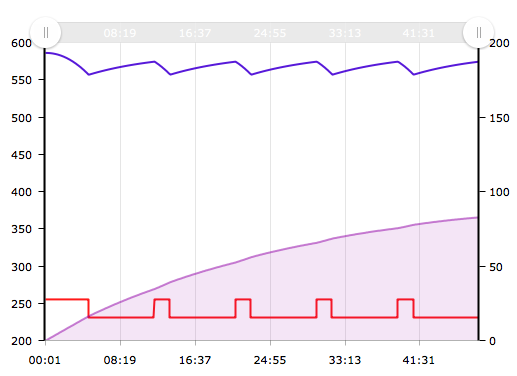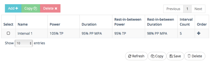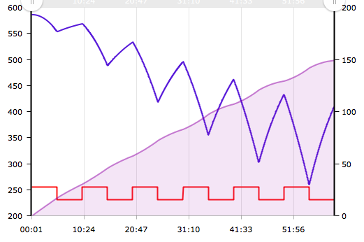Say I want each interval to get me to 95% MPA (that may sound easy but it can be quite hard if you have a tough training schedule). Then I just set the duration of my 105% interval to have a duration that takes me down to 95% MPA and then the 95% “recovery” portion to bring me back to 98% MPA. The following graph shows what Xert says my workout should look like.